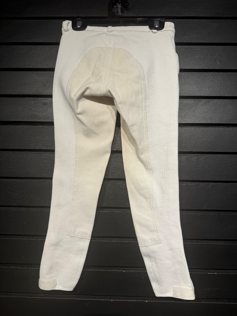 Kids size 12 ELT brand white full seat breeches with a front zip and velcro bottoms, in very good condition; no stains.