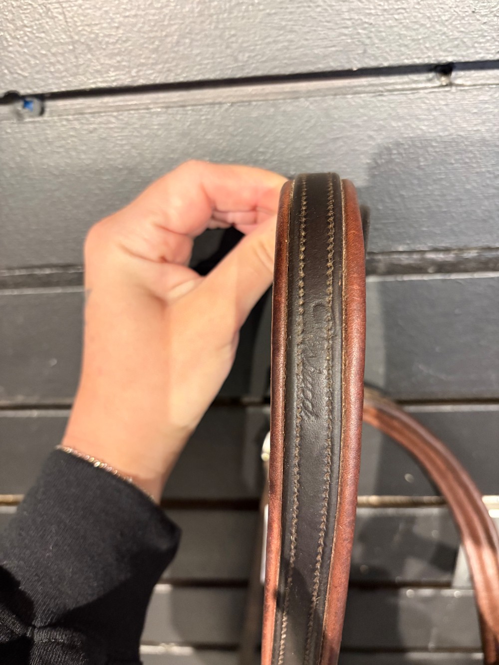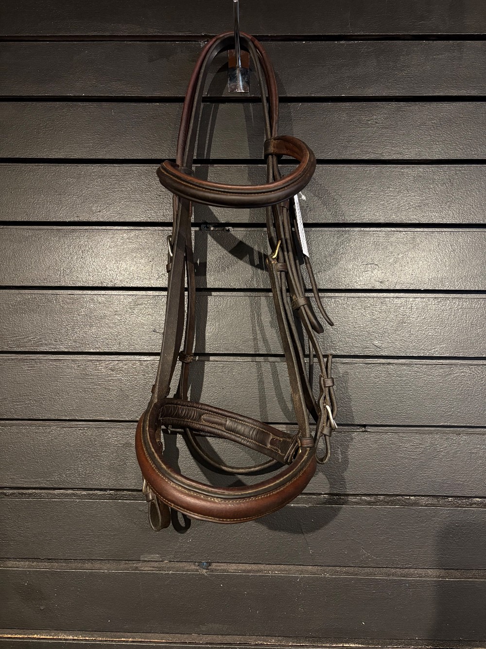Vespucci headstall with Bobby's English tack noseband, matches well other than the hardware being silver and gold. Beautiful leather and in good condition. Flash has been removed.