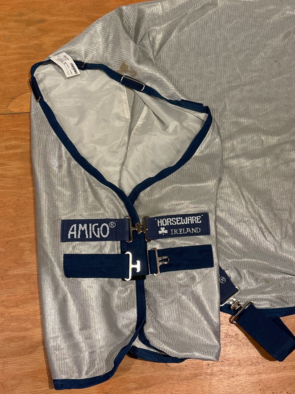 Amigo pony fly sheet size 60", neck not included but has the attachments to add one. In like new condition, no holes or snags.