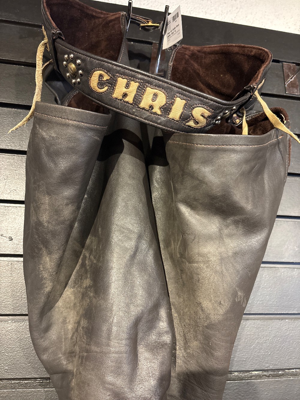 Full leather English chaps, no tag but fit like an XS, "Chris" on the belt at the back.
