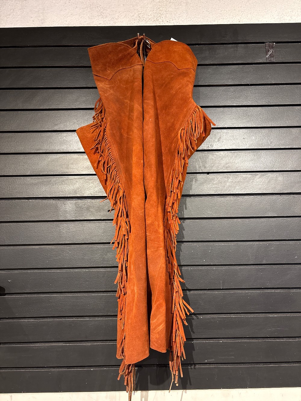Full suede/leather chaps with fringe, waist measures 37", in excellent condition.
