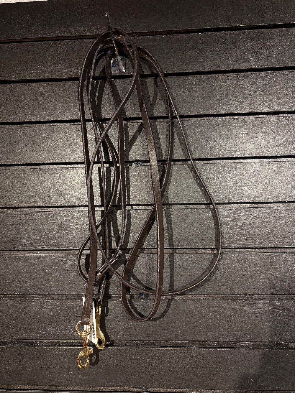 Dark brown with brass Val Du Bois leather draw reins with clips, stamped full in like new condition.