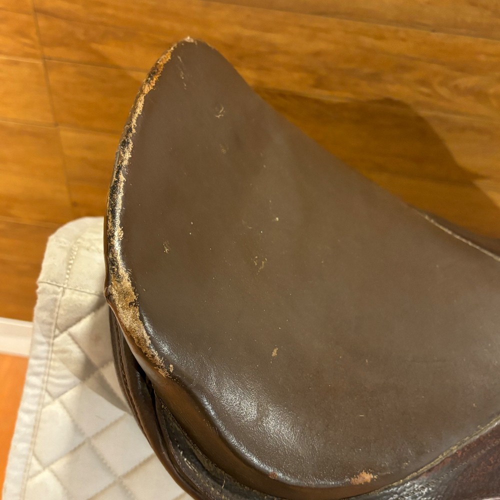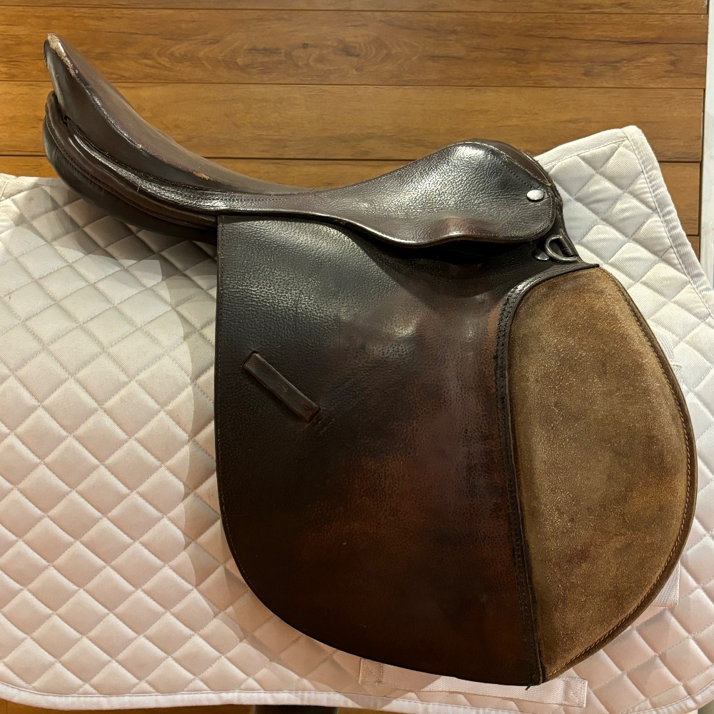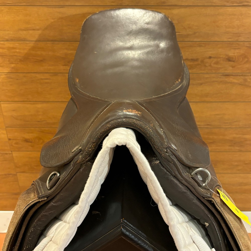 English close contact saddle, 17" seat and a narrow gullet, older but still has some life left.